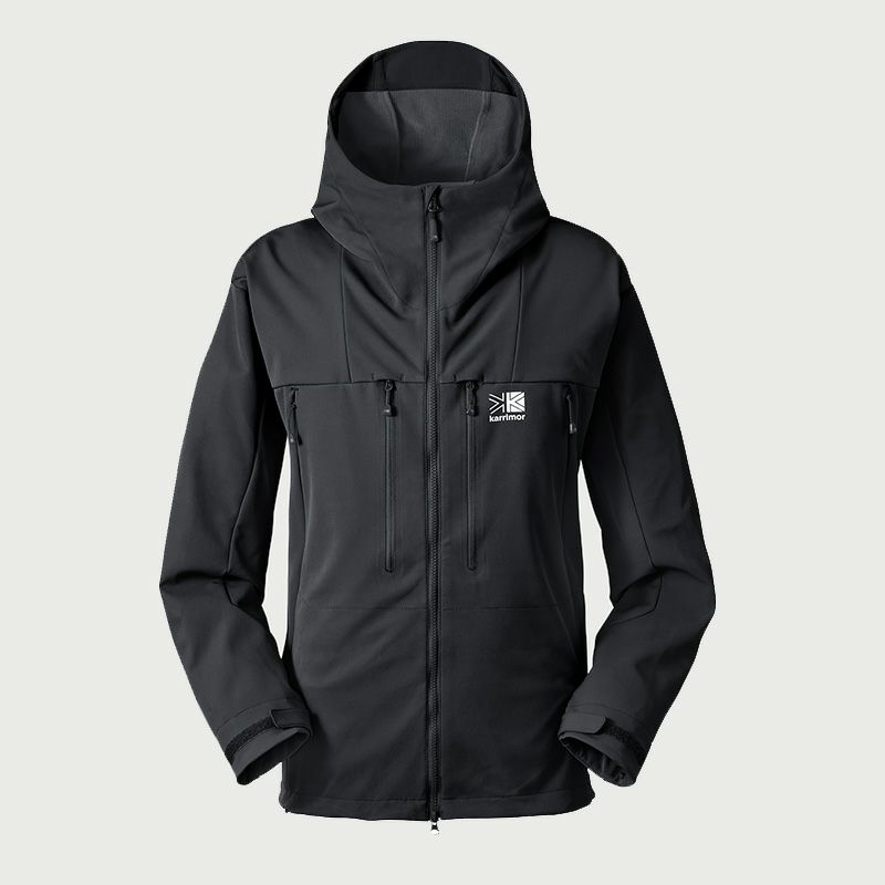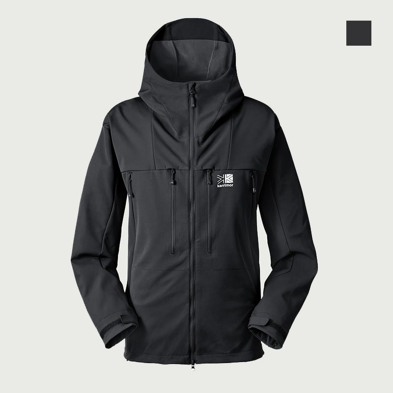 防風性・摩耗性及びストレッチ性に優れたソフトシェルフーディー。
