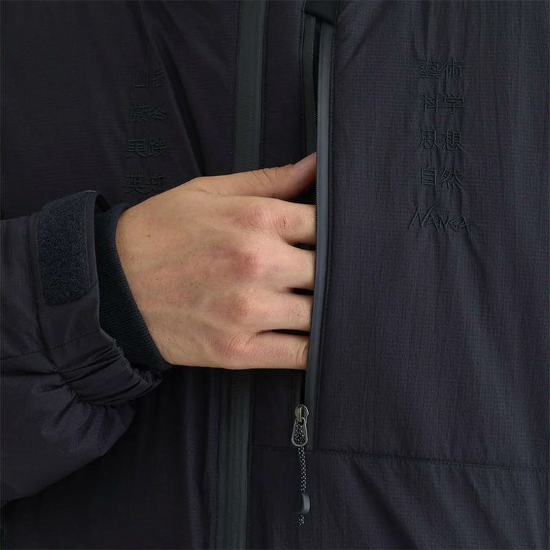 森羅万象を意味する「藝術科学思想自然」を左胸に、 右胸にはNANGAの30周年に渡る足跡を讃える「山岳厳冬実践英知」をボディ同色の刺繍。ナンガとタコマフジのダブルネームらしいデザインに。