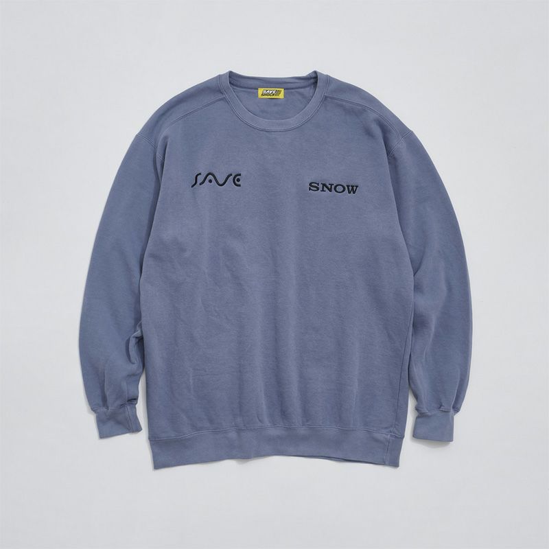 "SAVE THE SNOW"のメッセージ刺繍入りの冬にぴったりな裏起毛クルースウェット。