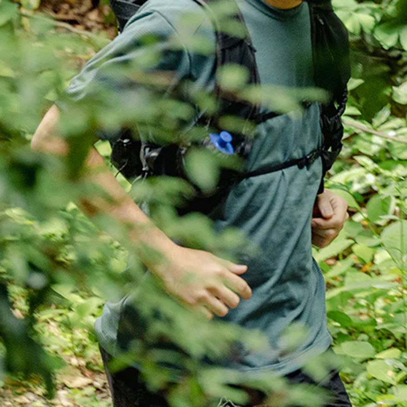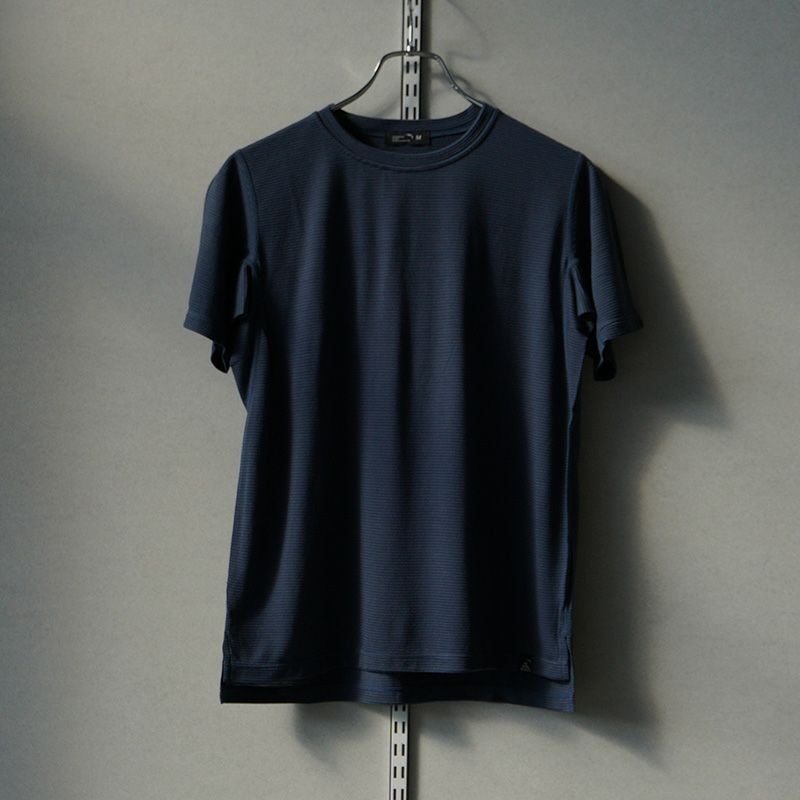 凹凸のあるボーダーメッシュ構造により高い通気性とリサイクルポリエステル糸で速乾性を高めます。