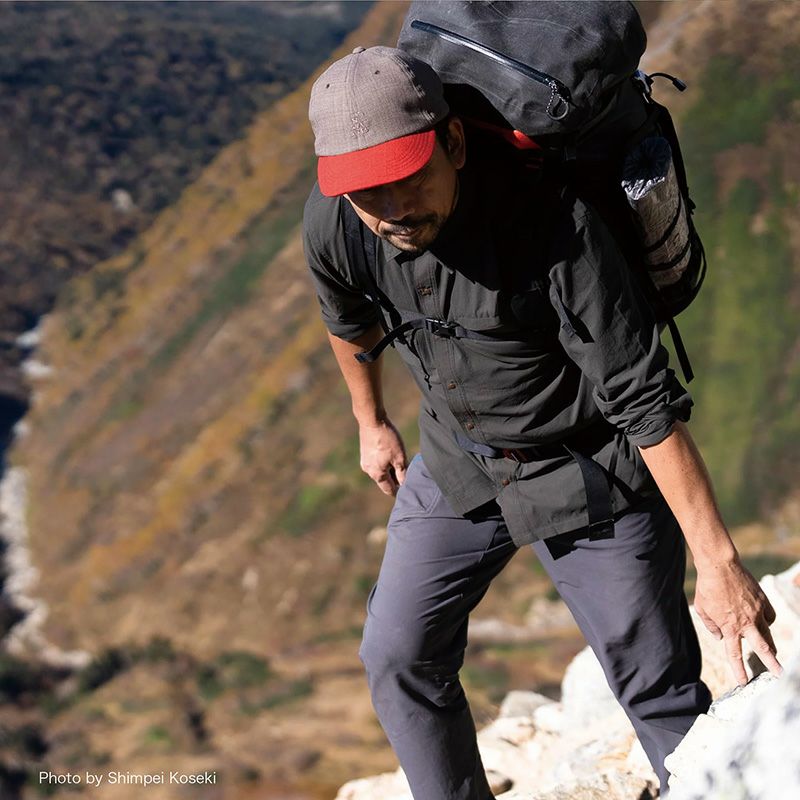 リサイクル100%のナイロン生地は、水を含むと重くなるポリウレタンを使わずに織りで高いストレッチ性を持っています。また凹凸感が強くザラっとしているので汗をかいても肌離れが良く夏の高山にもピッタリです。