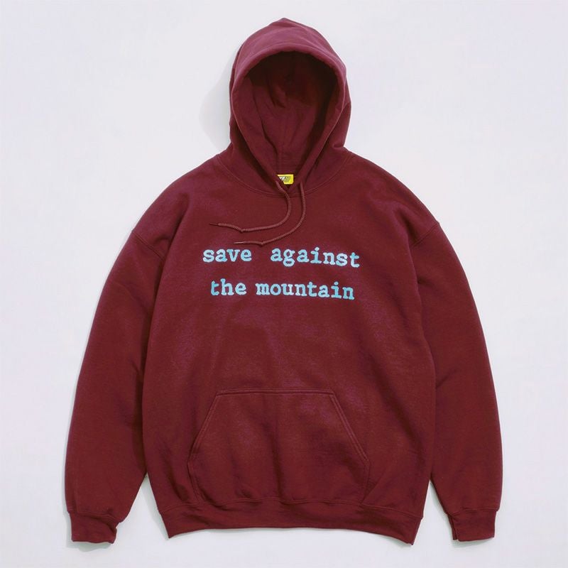 "SAVE AGAINST THE MOUNTAIN"のメッセージプリント入りプルオーバーフーディ。
