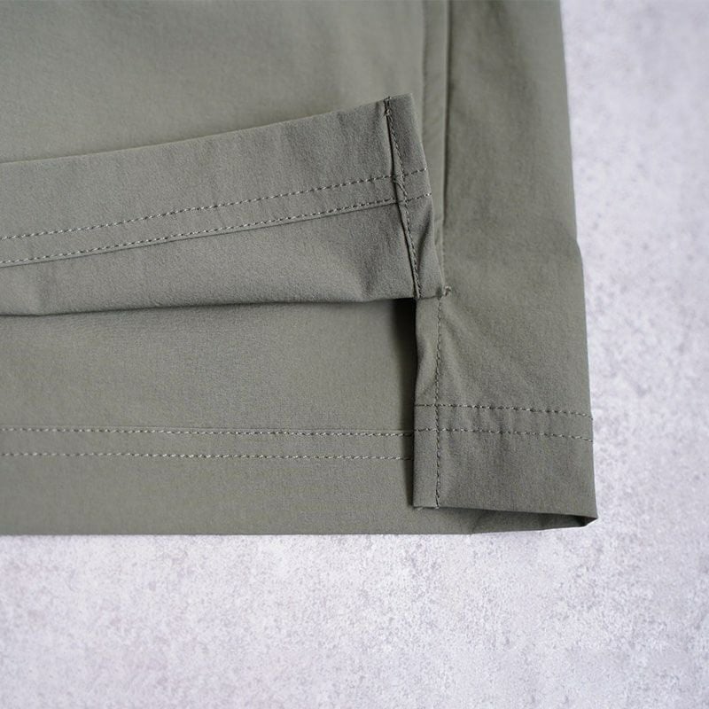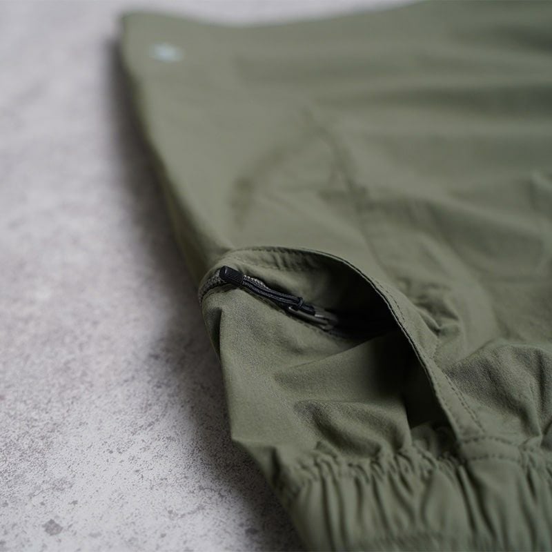 ストレッチナイロンにガゼットクロッチ、6インチ(15cm)の股下に裾のスリットと足の動きを妨げません。使い勝手に優れるポケットも備わっております。