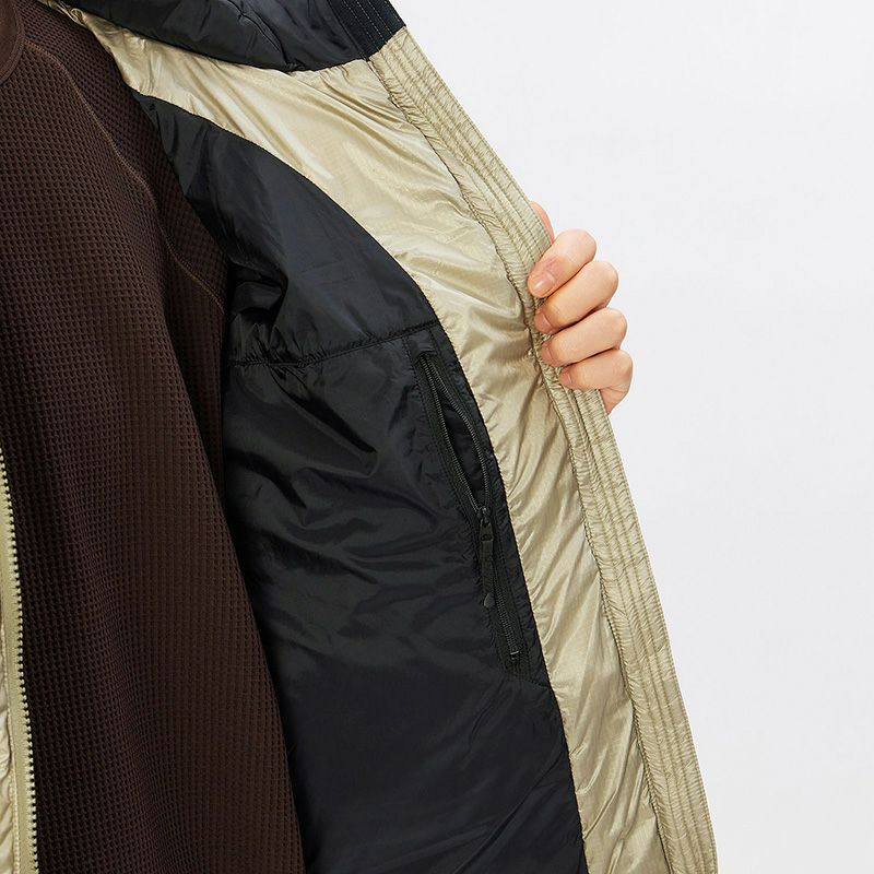 ダウンのバッフル構造は、ダウンが背中の中心部分に集まる形状になっているため、体幹を効率的に保温。首まわりにもダウンチューブを配し、コールドスポットを少なくしています。