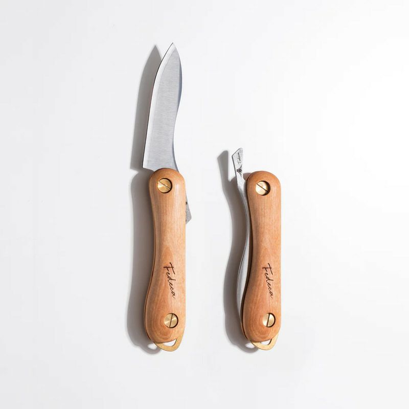 「折り畳める包丁」をコンセプトとした、折畳式料理ナイフの形状をそのままに、より携帯性を重視しつつ包丁の操作性を両立する、切りやすくてコンパクトなナイフです。