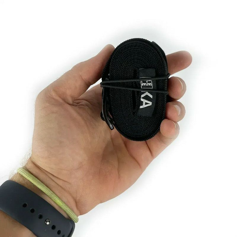 木に巻き付け、フックを掛けるだけで長さ調整が完了するため、ロープワークを必要とせず、誰でも安定したテンションで設営することができます。