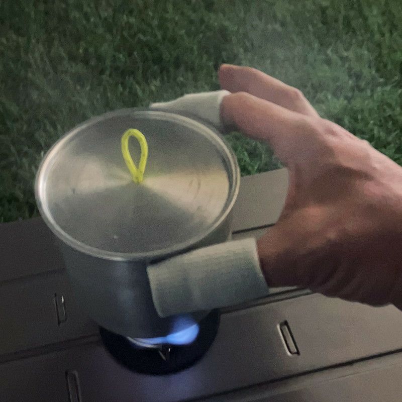 湯沸かしで熱くなったクッカーを持ち上げてお湯を注いだり、メスティンなどの熱くなったクッカーの蓋を持ち上げたりする為のフィンガーサックです。