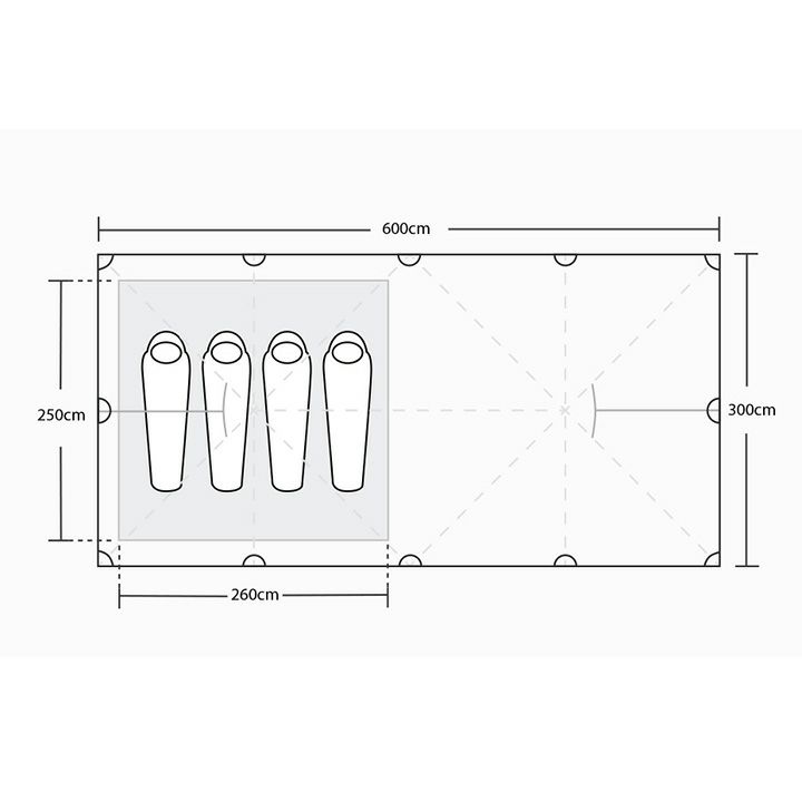 付属の4人用インナーテントを使う場合は、残り半分のスペースが前室となったダブルウォールテントのようなイメージ。前室部分はロースタイルであれば4人で座って過ごせる位のスペースがあります。