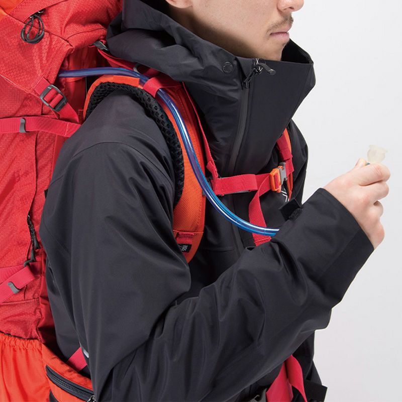 ボディ内部にパックを収納し、チューブは本体上部のホールを経由しショルダーハーネスへ。先端部分のホルダーは左右に設けています。 ※画像で使われているハイドレーションチューブは付属しません。