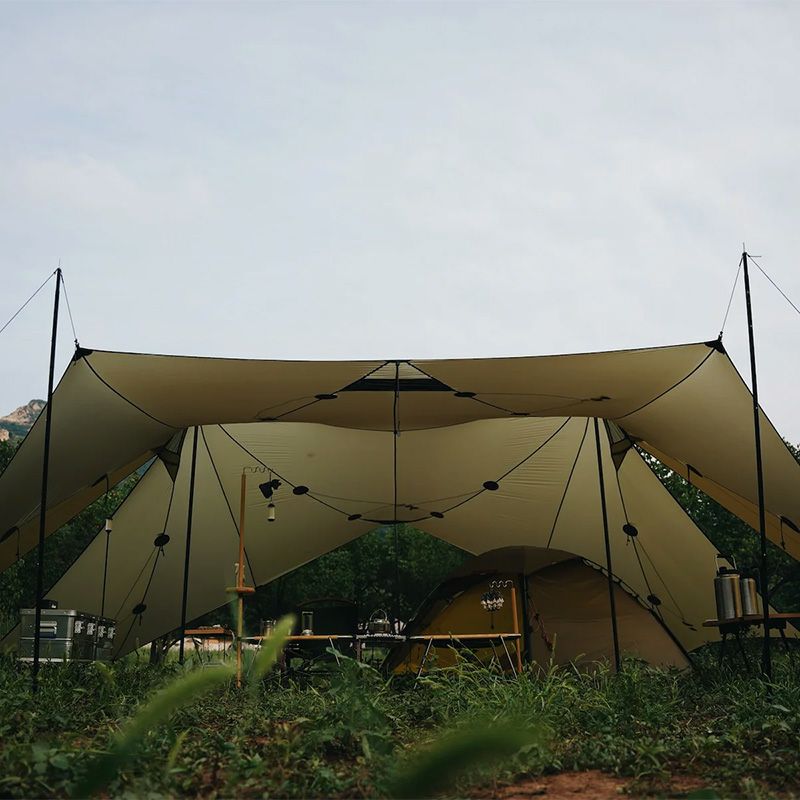 フルクローズの状態から、ポールを別途追加することでタープのように様々なセットアップが可能。