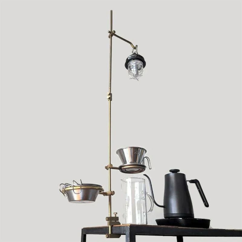 前作のバークランプドリッパースタンドをベースにコンパクトに持ち運べる『バークランプランタンスタンド』を開発しました。製品名に使用されるバークランプとは旗金(ハタガネ)を意味します。旗金は木工作業において材料を締め付ける日本古来の大工道具で、家具の組み立てや木材の接着に用いられる道具です。その固定具としての機能に着目し、第一弾商品としてドリップスタンド、そして第二弾商品として『ランタンスタンド』が生まれました。