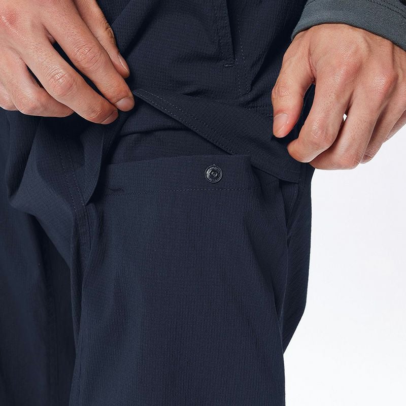 高い強度とストレッチ性を併せ持つ、コーデュラ&ナイロンを採用したパンツ。テーパードシルエットで膝部分にダーツを入れ、トレッキングなどに使える動きやすいデザインに仕上げています。デザインのポイントになっているのが、大きめのカーゴポケット。右側はファスナー付きで、小物の収納に役立ちます。