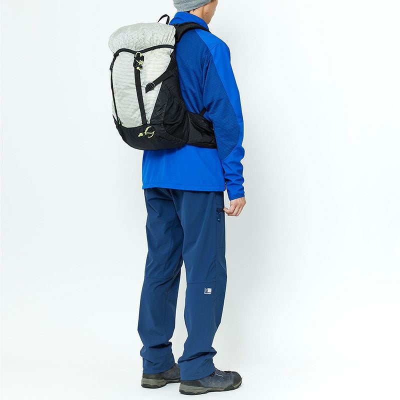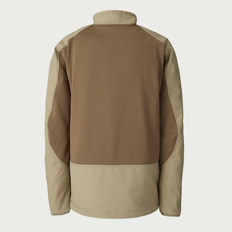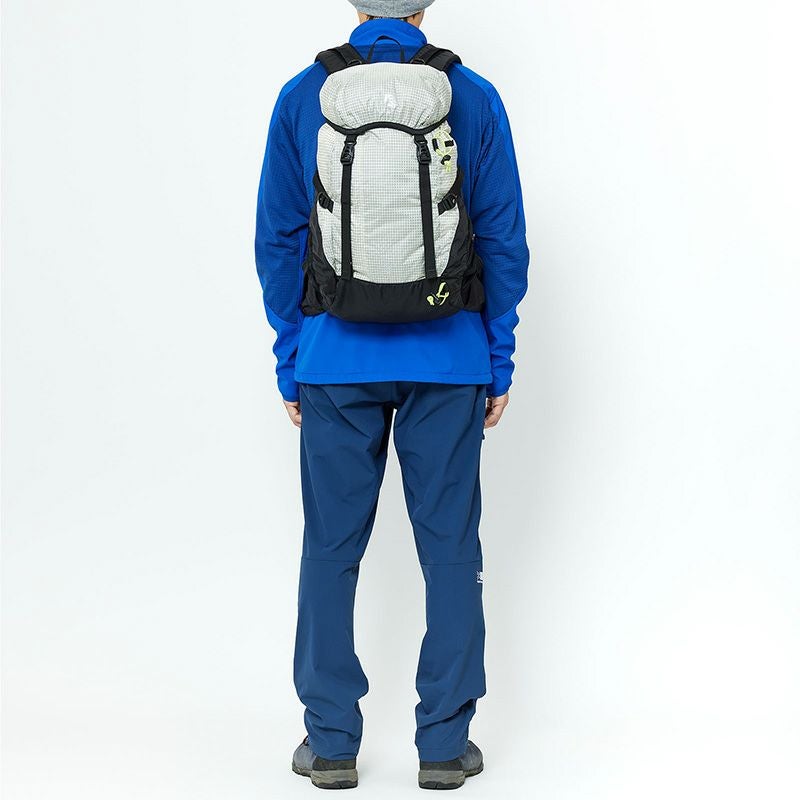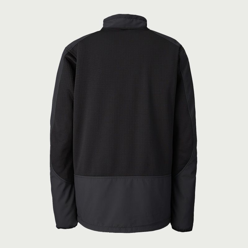 軽量でソフトな風合い、吸汗速乾性に優れたOcta®と、20Dナイロン布帛を圧着した素材をベースに、吸汗速乾性およびストレッチ性に優れたPOLARTEC®POWERGRIDTM素材を背面パネルへ採用することにより、ドライで温かく、アクティブな動きにも追従する快適な一着。