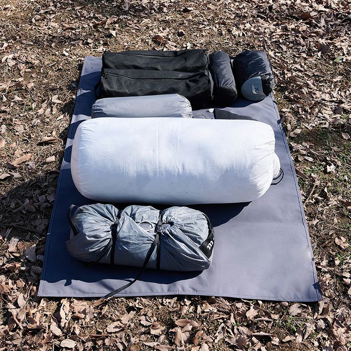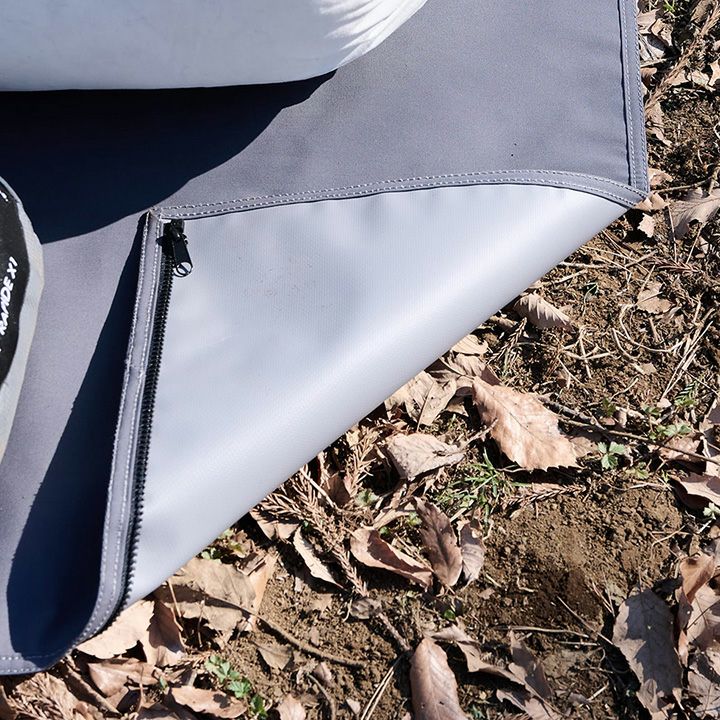 車載のキャンプギアの載せ下ろしや、撤収時の汚れ防止に活躍するマルチシートです。裏面が厚手のターポリンのため、湿った地面に引いても水分の浸透を防ぐことができます。シートは2層構造の袋状になっており、シートの中に寝袋や落ち葉などを詰め込むことで、大きなクッションとして使用できます。半分に折り畳んでも使えるよう、ジッパーを両サイドに配置しています。