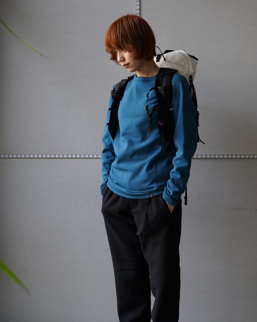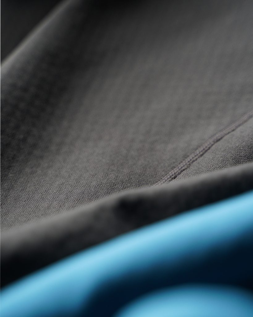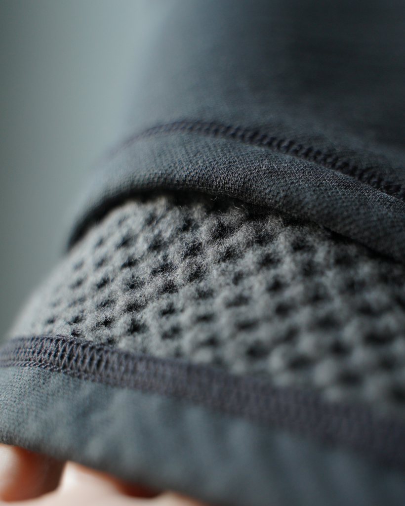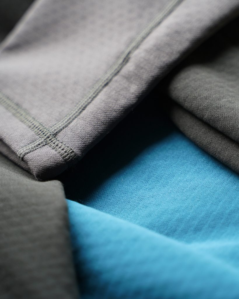 螺旋状のポリエステルフィラメントをウール繊維束で包んだNIKKE AXIO®素材を使用し、肌に接触しない格子状(グリッド)の凹凸面が汗冷えを軽減し、汗を素早く吸い上げて乾燥させるため、汗をかいても快適です。