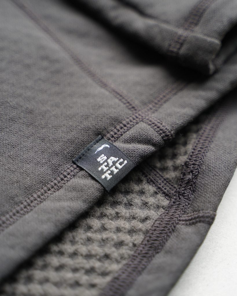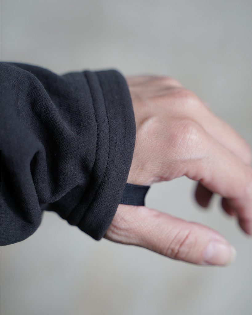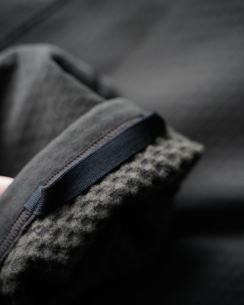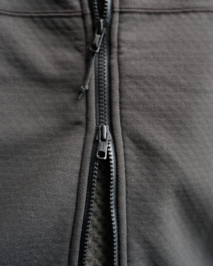 螺旋状のポリエステルフィラメントをウール繊維束で包んだNIKKE AXIO®素材を使用し、肌に接触しない格子状(グリッド)の凹凸面が汗冷えを軽減し、汗を素早く吸い上げて乾燥させるため、汗をかいても快適です。