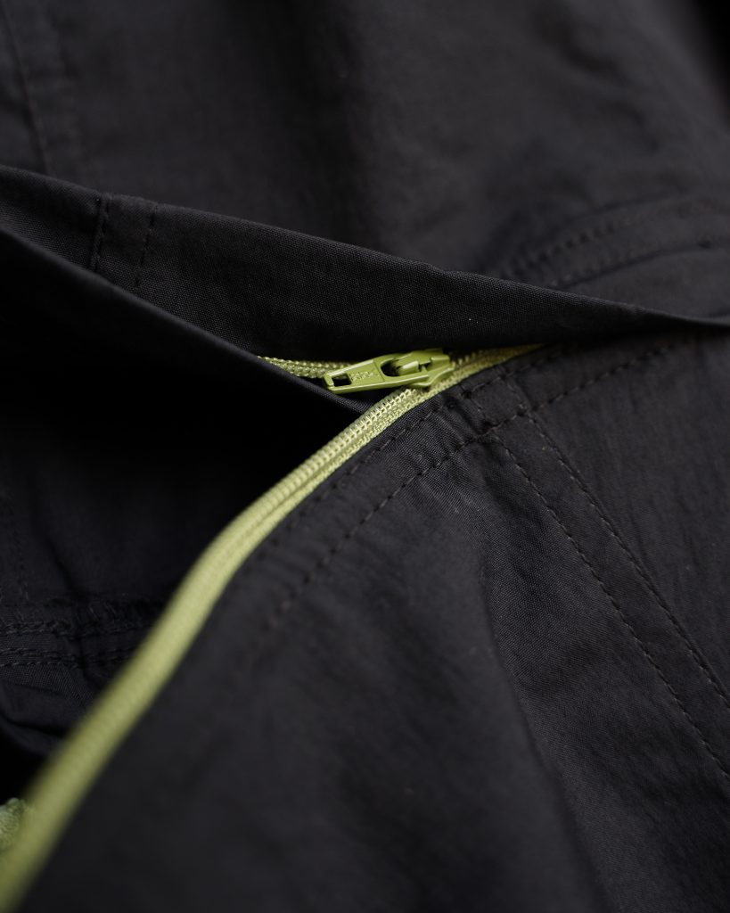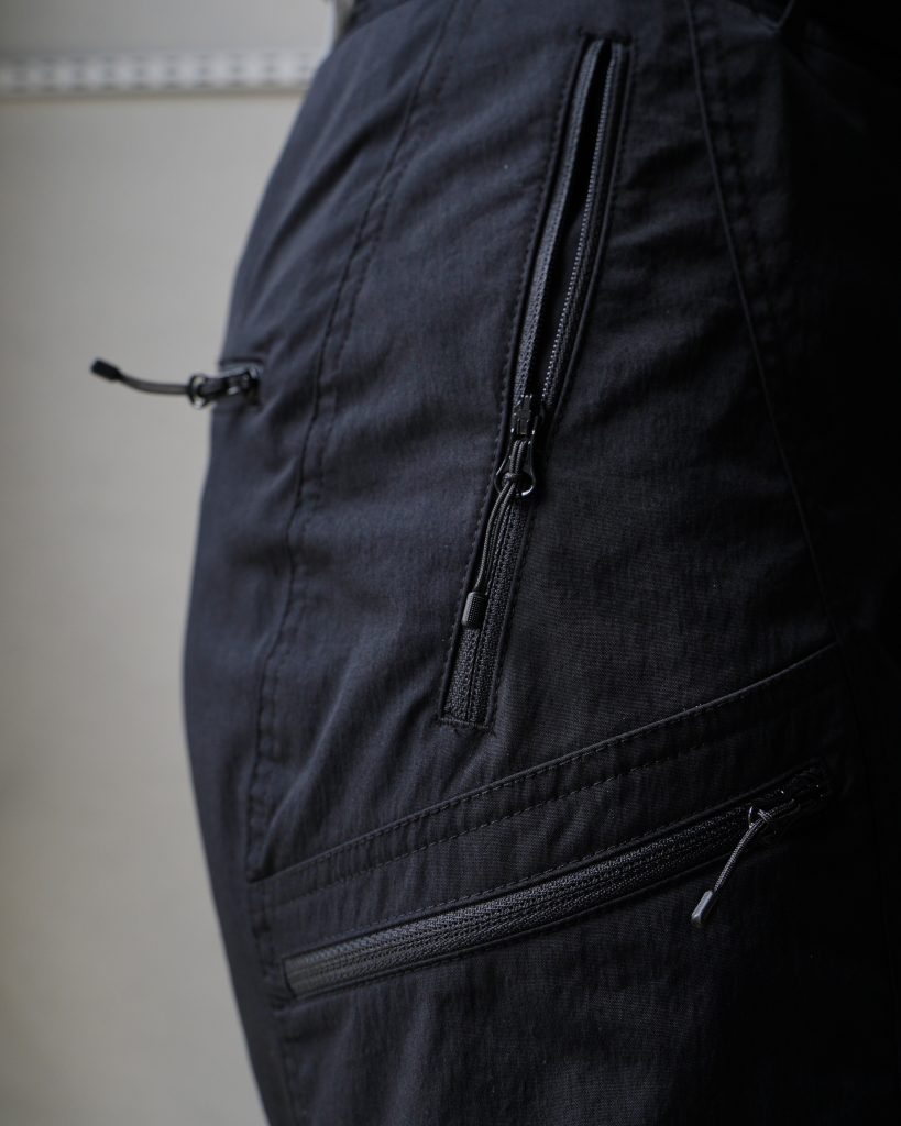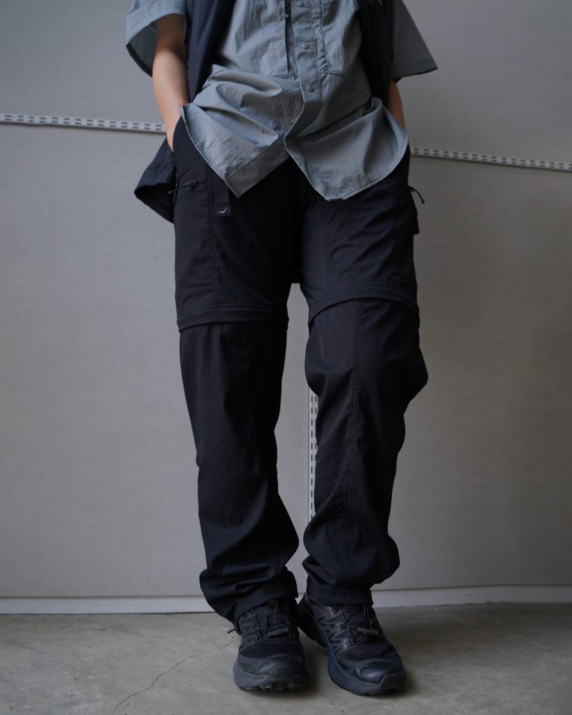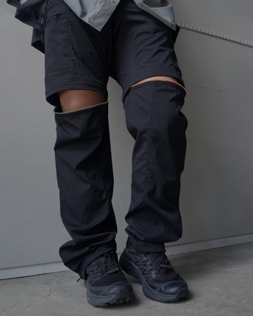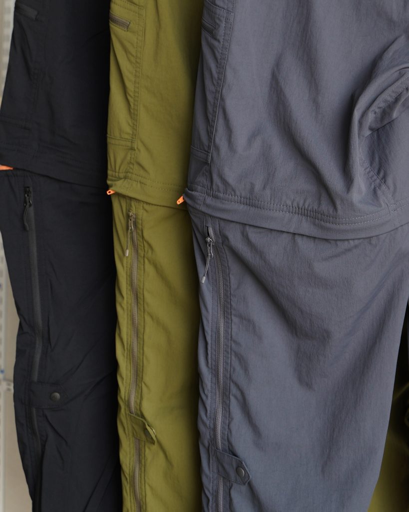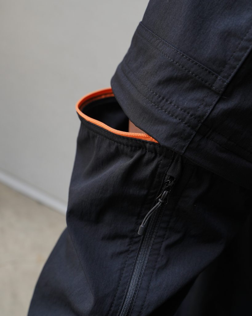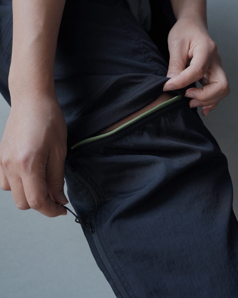 ロング丈とショート丈をジップで切り替えられる構造により、樹林帯の涼しい朝はロングパンツとして保温性を確保し、