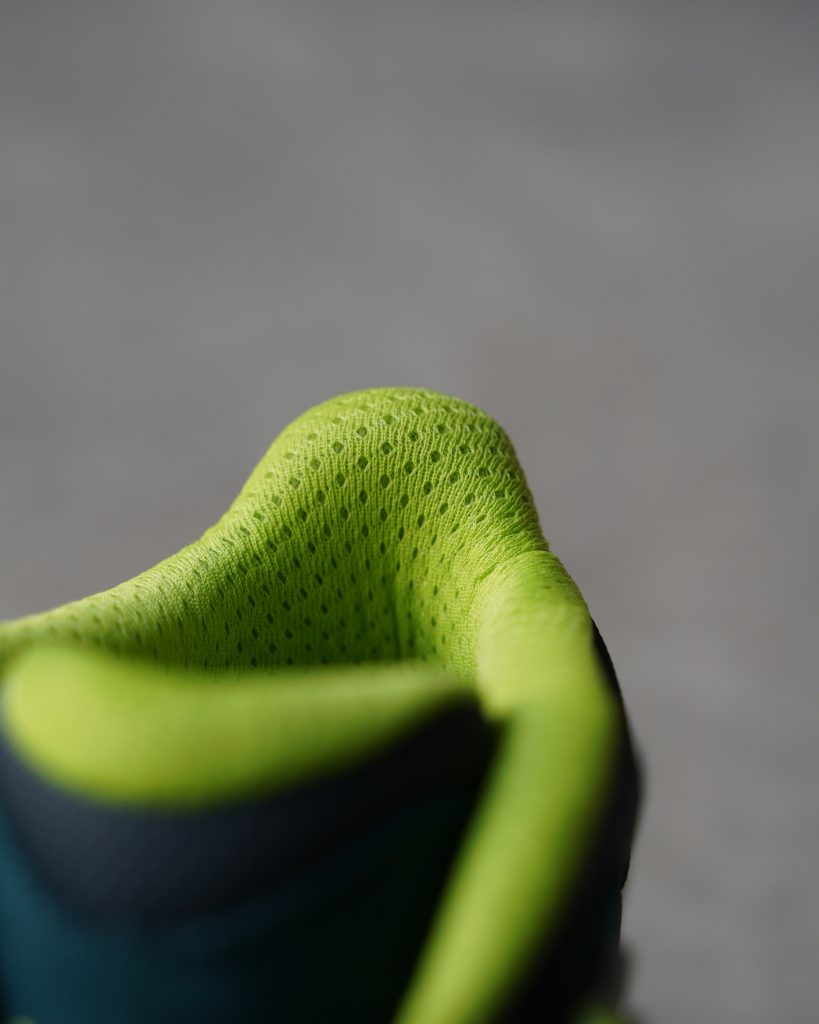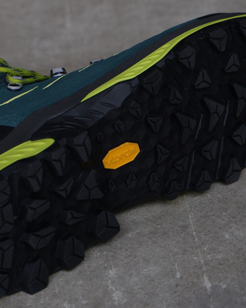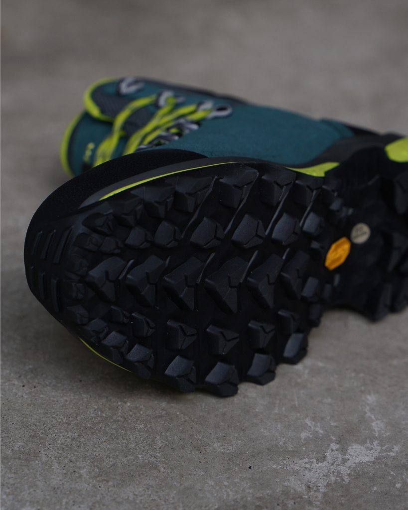 ソールは深いラグを採用し、足先部分は様々な地形でのトラクションコントロールが効きやすいデザイン、ヒール部は特に下りでの効果を発揮するブレーキ性能を持たせています。